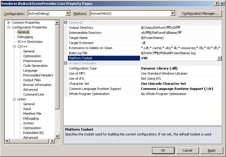 다음과 같이 [General] - [Platform ToolSet]을 v90으로 맞춘다. v100은 10.0이라는 뜻으로 Visual Studio 2010이며, v90은 2008, v80은 2005, v71은 2003, v70은 2002라는 것은 Visual Studio 사용자라면 익히 일수 있는 버전번호이다.